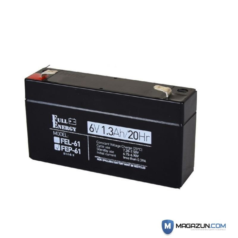 Full Energy FEP-61 – свинцово кислотный аккумулятор на базе AGM технологии с емкостью 1.3 Aч и рабочим напряжением 6В для систем сигнализации, пожарных систем, источников бесперебойного питания и детских электромобилей. Использование AGM технологии несете в себе ряд преимуществ и главным из них является практически отсутствие выделения вредных и опасных газов, что способствует их безопасной эксплуатации внутри жилых помещений. Связано это с применением абсорбированного электролита. Корпус полностью герметичен от чего исключена возможность вытекания кислоты и предоставлена возможность установки АКБ в любом положении за исключением перевернутого состояния. Аккумулятор с легкостью выдерживает до 500 циклов глубокой разрядки. Размеры: 96 x 50 x 24 миллиметра.