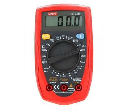 Мультиметр UNI-T UT33B, предназначен для измерения постоянного и переменного напряжения AC/DC, силы постоянного тока DC, сопротивления а также выполнения проверки диодов и тестирования батарей. Особенностью цифрового мультиметра UNI-T UT33B является автомат выбора диапазонов измерения. Функция проверки заряда батарей, подсветка дисплея и функция удерживания результата измерения.