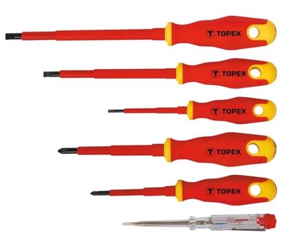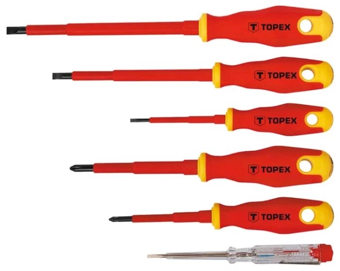 (SL/Phillips/PH) отверок длиной стержня 100-150 мм. произведена и высокопрочной хромомолибденовой стали. А также в набор входит индикатор напряжения 125 - 250 В. Рукоятка выполнена из диэлектрического покрытия которое обеспечивает безопасность работ до 1000 В. Оснащены магнитным наконечником который отвечает стандарту 56 HRC. Качество бренда Topex подходит для домашних мастеров.