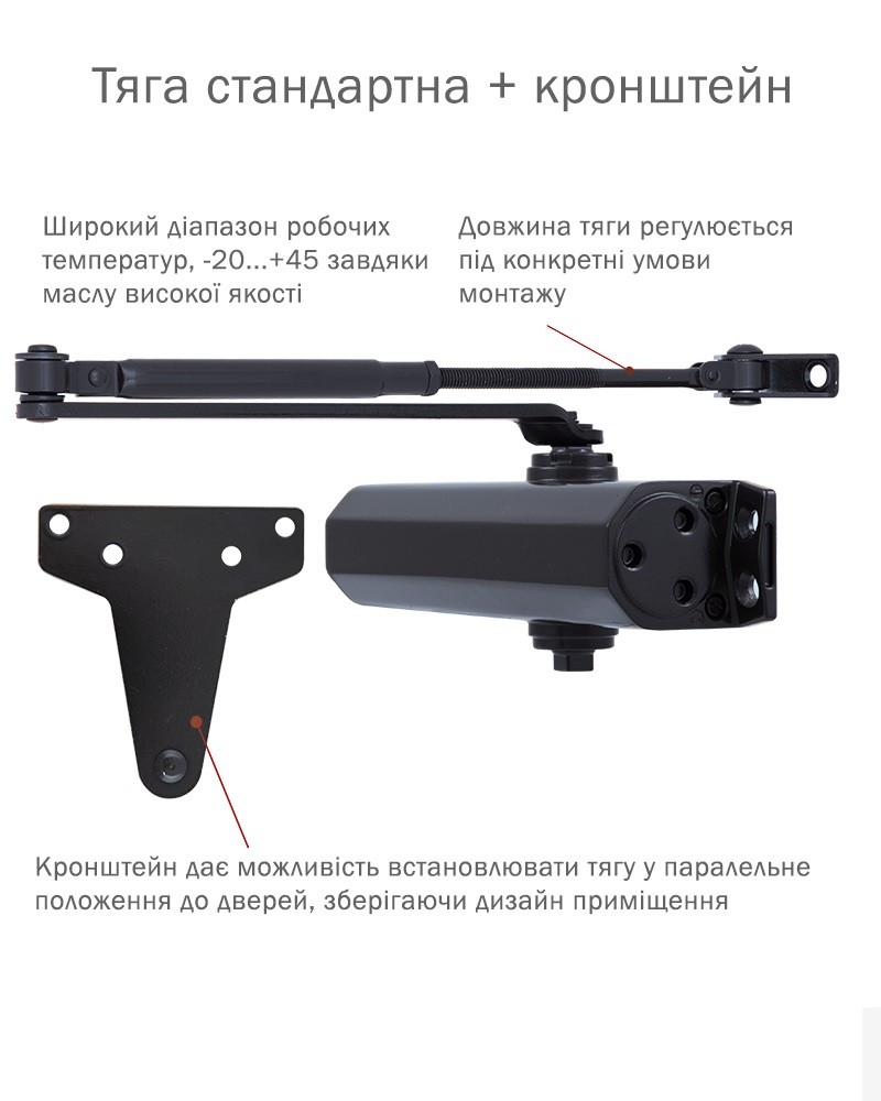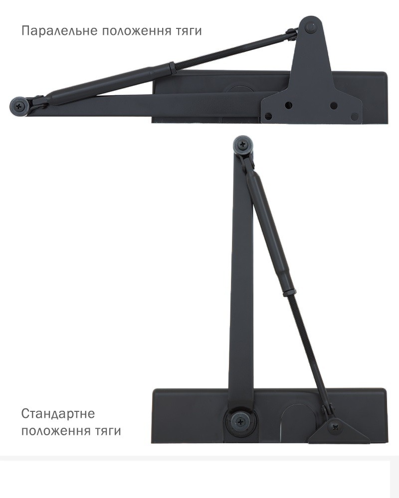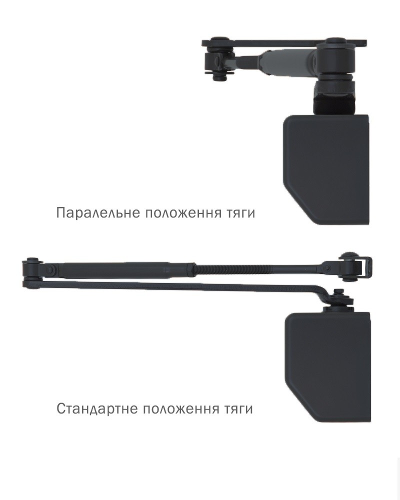 В комплектацию к доводчику идет универсальная тяга (стандартная плюс специальный крепеж параллельной тяги) и декоративная крышка.