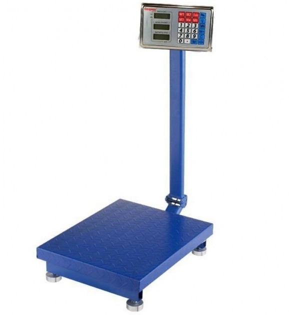 Торговые электронные весы со стойкой, рассчитанные на максимальную нагрузку в 500 килограммов. Минимальный вес для успешного взвешивания 200 грамм. Питание здесь построено от сети. Вывод показателей идет на дисплейa, размещенный вверху стойки. Цена деления 5 грамм.