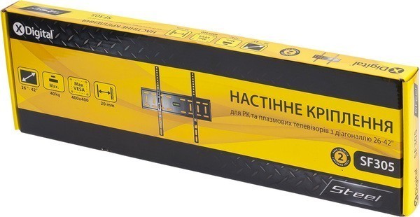 X-Digital SF305 – надежный кронштейн. Кронштейн рассчитан на телевизоры с диагональю экрана от 26 до 55 дюймов и весом до 40 килограммов. Минимальное расстояние от стены составляет 2 сантиметра. Цвет черный. Монтажный набор входит в состав комплекта.