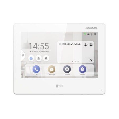 HikVision DS-KH9310-WTE1 – накладного монтажа IP домофон с огромным семи дюймовым цветным сенсорным TFT дисплеем на борту. Дисплей может похвастаться отменной детализацией при эффективности 1024 на 600 пикселей. Управление домофоном находится по популярной операционной системой Android. Показатель ROM и RAM равен 4 гигабайта и 1 гигабайт соответственно. В поддержку аудио связи идет встроенный всенаправленный микрофон и динамик. Связь по сети строится посредством RJ45 10/100 Мб/с порта или Wi-Fi модуля. Среды дополнительных портов восемь входных и два выходных тревожных порта, RS485 порт. Питание с использованием PoE технологии. Рабочее напряжение 12 Вольт. Мощность потребления HikVision DS-KH9310-WTE1 до 8 Ватт.