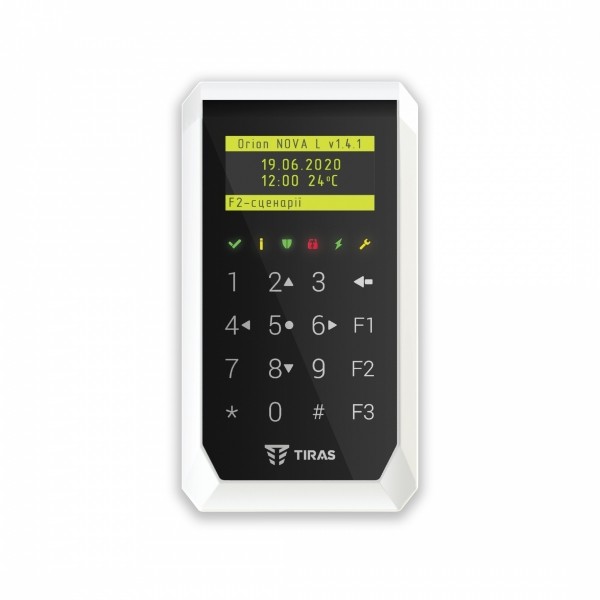 Тирас K-PAD OLED – потрясающая клавиатура для сенсорного управления и программирования системы охраны на базе ППК Орион NOVA II. На борту идет контрастный OLED дисплей. Количество зон индикации 16-ть. Имеет место транзисторный выход, встроенный интерфейс Touch Memory и 2 собственные зоны. С активацией кнопки она поддается подсветке. Наработка на отказ Тирас K-PAD OLED не менее 20 000 часов. Связь с ППК строится по шине RS-485 на дистанцию до 1000 метров. Для питания потребуется подача на устройство напряжения от 9,3 до 15,2 Вольт. Потребление тока на уровне 50 мА. Комплект поставки Тирас K-PAD OLED включает в себя четыре ножки, паспорт и саму клавиатуру.