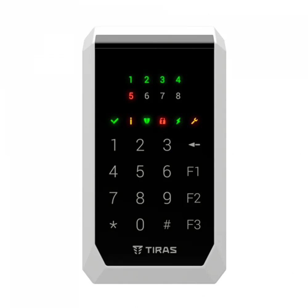Тирас K-PAD8+ – потрясающая клавиатура для сенсорного управления и программирования системы охраны на базе ППК Орион NOVA II. На борту идут восемь светодиодных индикаторов зон. Встроенный бесконтактный считыватель идентификаторов Mifare и NFC-метки. Имеет место транзисторный выход, встроенный интерфейс Touch Memory и 2 собственные зоны. С активацией кнопки она поддается подсветке. Наработка на отказ Тирас K-PAD8+ не менее 20 000 часов. Связь с ППК строится по шине RS-485 на дистанцию до 1000 метров. Для питания потребуется подача на устройство напряжения от 9,3 до 15,2 Вольт. Потребление тока на уровне 50 мА. Комплект поставки Тирас K-PAD8+ включает в себя четыре ножки, паспорт и саму клавиатуру.
