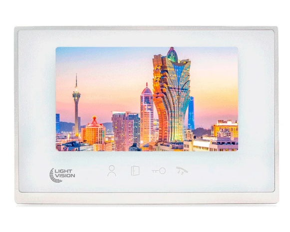 LightVision Macao FHD WiFi – яркий представитель видеодомофонов с огромным цветным семи дюймовым IPS дисплеем (1024х600 пикселей), интеркомом (на 6 мониторов), детекцией по движению и мультиформатностью работы. Так модель рассчитана на входной сигнал AHD / TVI / CVI типа. Всего одновременно домофон работает с двумя панелями вызова и двумя видеокамерами. Под хранение материала на борту домофона имеется слот под подключение SD карточки памяти с объемом не более 128 гигабайтов.