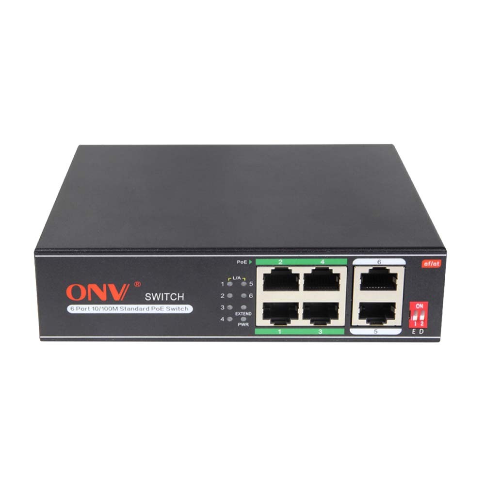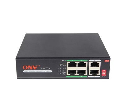 ONV H1064PLD – компактный и недорогой сетевой коммутатор с поддержкой PoE (IEEE802.3af/at) технологии для офисов небольших размеров. На бору коммутатора Вы обнаружите четыре Fast Ethernet (10/100M) порта с поддержкой PoE и два Fast Ethernet (10/100M) uplink порта. Нагрузка на PoE порт составляет 30 Ватт. Общая же PoE нагрузка 60 Ватт. Успех передачи при PoE достигает отметки в 250 метров. Отличительной особенностью модели есть поддержка перезапуска питания устройства и восстановления соединения коммутатором после случаев со сбоями в сети PoE. Размеры: 143x115x40 миллиметров.