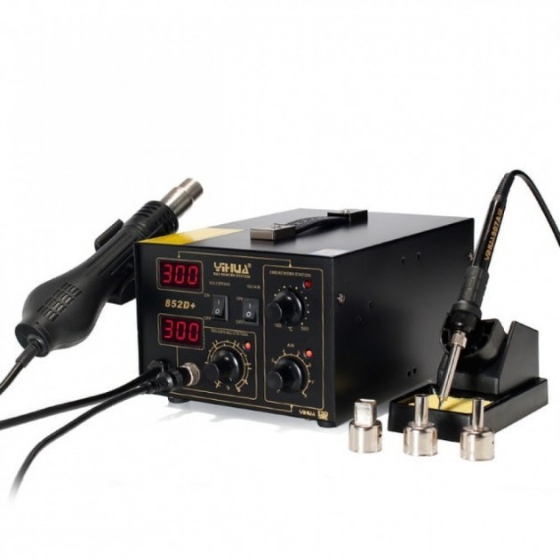 Yihua 852D+ фен (бесщеточный) – паяльная станция термовоздушного типа, рассчитанная как под контактную так и бесконтактную пайку, а также под демонтаж различных компонентов. Предложенный станцией паяльник идет с качественным керамическим нагревателем. Термофен включается отдельно от паяльника и поэтому может работать с ним одновременно. Имеет место два дисплея. При мощности паяльника 75 Ватт и термофена 650 Ватт общая мощность станции составляет 700 Ватт. Температура паяльника задается в рамках от 200 до 500 градусов по Цельсию, воздушного потока (28 л/мин) от 100 до 500 градусов по Цельсию. Предусмотрены высокоэффективная защита от статического напряжения. Гарантирована стабилизация температуры в 15 градусов для термофена и 10 градусов для паяльника. Рабочее напряжение 220 Вольт.