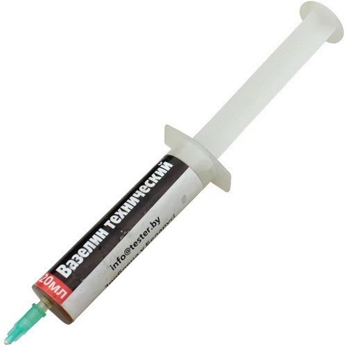Технический вазелин, применяемый для обработки контактов алюминиевых проводников с наконечниками на электрооборудовании, смазки поверхностей металлических деталей и предметов с целью транспортировки и хранения, смазки аккумуляторных клемм. Данный вазелин имеет объём 20 мл. Поставляется в шприцах. Изготовлен в Беларуси.