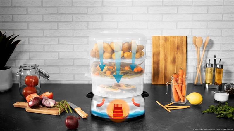 Vapovita 3000 Inox имеет большую емкость - 9 литров, разделенных на три разных контейнера. В каждом из них можно одновременно приготовить большое количество разных блюд, чтобы за несколько минут получить разнообразные и питательные блюда. Все готовится одновременно и равномерно, а вкусы не смешиваются, поэтому вы можете наслаждаться любимыми блюдами, не тратя много времени.