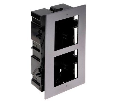 HikVision DS-KD-ACF2/S – специально разработанная рамка под врезной монтаж двух модульных панелей вызова. Монтажная основа идет из пластика, а крышка из авиационного алюминия. Размеры крышки: 236 x 124 x 4 миллиметра., размеры монтажной основы: 237 x 135 x 56 миллиметров. Рабочая температура находится в пределах от -40 до +55 градусов по Цельсию.
