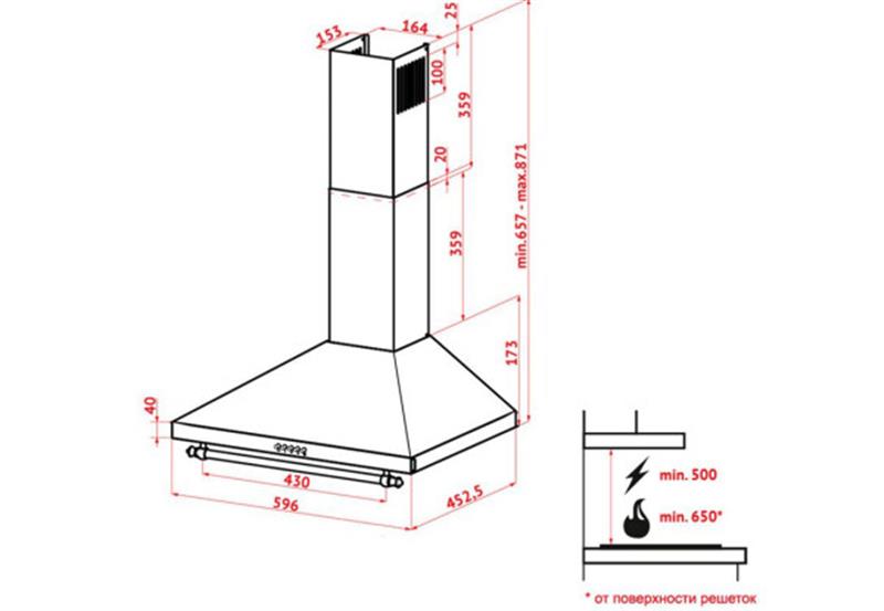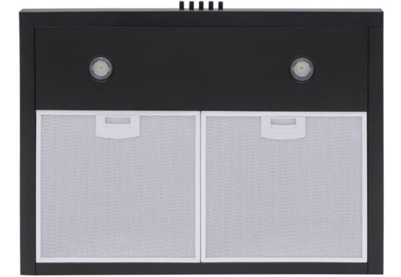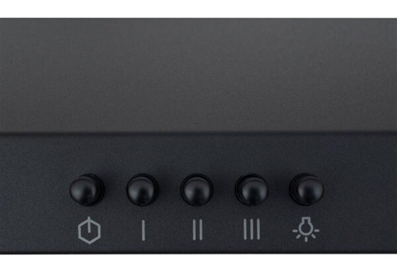 На передней панели располагается механическое кнопочное управление, где находятся клавиши переключения скоростей работы вытяжки, включения освещения и выключения прибора.