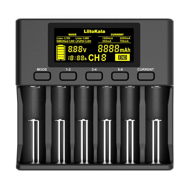 Liitokala Lii-S6 – небольшая, современная шести слотовая зарядка для аккумуляторных батареек типоразмеров AA, SC, AAA, С. Модель допускает выбор тока заряда из вариантов 0,5 , 1 и 2 Ампера. К зарядке допускаются батареи различных электрохимических систем. В частности успешной зарядке поддаются акб на базе Ni-MH/Ni-Cd/Li-ion/LiFePO4 систем. Первые три распознаются устройством автоматически и последний задается вручную. Роль индикатора в устройстве играет цифровой дисплей. Подключается зарядка к любому USB-источнику снабжения.