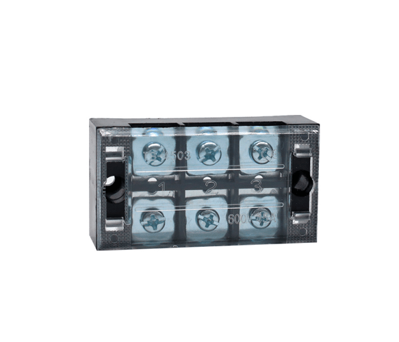 Voltronic TB-4503 – компактная клеммная колодка на три контакта с допустимой нагрузкой до 45 Амперов и напряжением до 600 Вольт. Сечение провода 0,5-4,0мм2. Все клеммы идут на биметалл основе. Цвет черный.