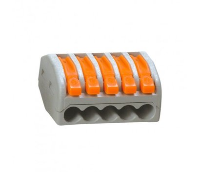 PRC PCT-215 – многоразовой эксплуатации клемма быстрого монтажа на 5 одножильных проводов с сечением от 0,08 до 4 мм2 или многожильных до 2,5 мм2. Допустимая нагрузка по току 24 Ампера. Номинальное напряжение 400 Вольт. Цветовое исполнение оранжево-серый.