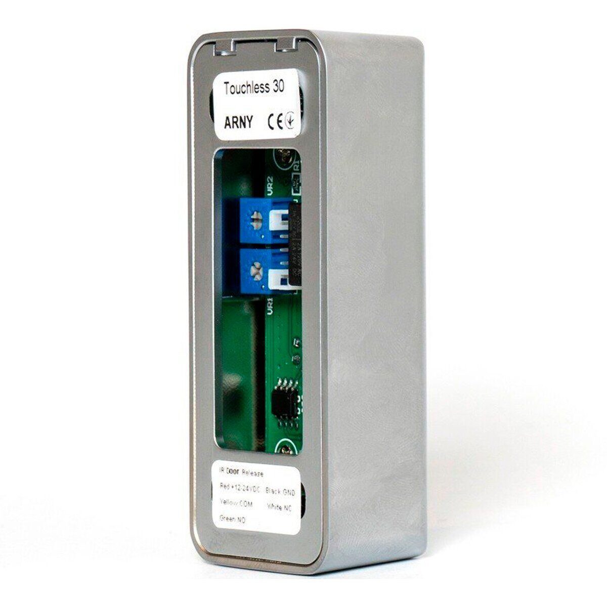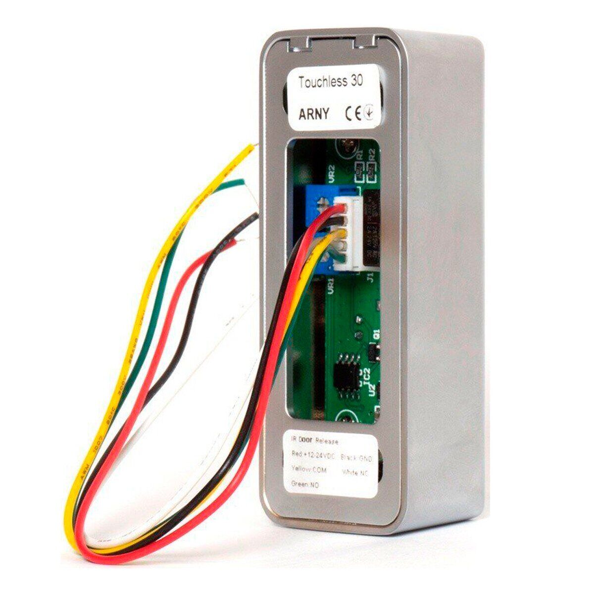 Arny Touchless 30 – разработанная в очаровательном дизайнерском стиле бесконтактная кнопка выхода предназначенная под использование в составе систем контроля доступа под открытие электрозамка. Рабочая дистанция бесконтактной работы регулируется от 3 до 15 сантиметров. Весь корпус идет из прочной нержавеющей стали. Линейные выходы: NC/NO/COM. Возможно задать задержку на открытие от 0,3 до 30 секунд. Монтаж Arny Touchless 30 производится накладным образом. Средой эксплуатации выступает исключительно помещение. Питание Arny Touchless 30 допустимо напряжение от 12 до 24 Вольт. Размеры: 80х32х23 миллиметра.