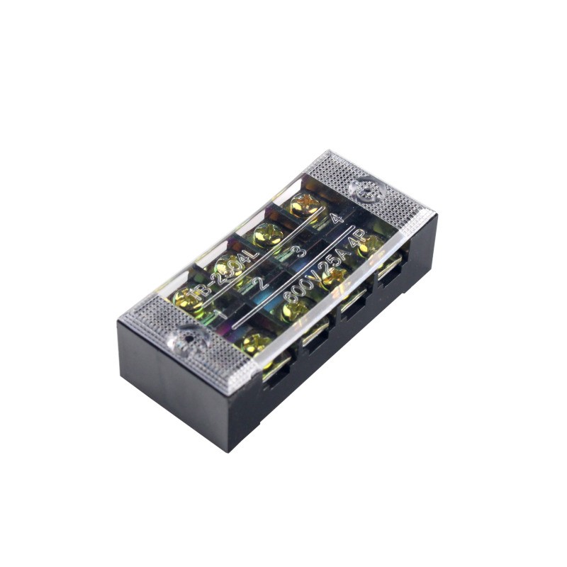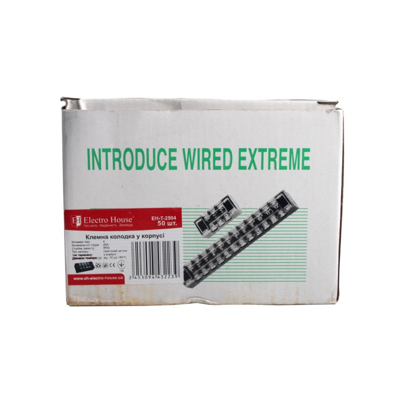 Клеммная колодка в корпусе EH-T-2504 от компании "ElectroHouse" предназначена для удобства монтажа электрических проводов в цепях управления, сигнализации, освещения и т.д.Клеммная колодка представляет собой диэлектрическое основание из негорючего пластика, на котором установлены контактные планки, надёжно изолированные друг от друга. Планки изготавливаются из лужёной латуни. Контактные планки зажимов рассчитаны на пропускание больших токов в сетях переменного тока частотой 50 Гц. Эта модель клеммной колодки в корпусе имеет четыре клеммных пары с винтовым зажимом провода, ее номинальный ток 25А. Позволяет соединить медные и алюминиевые провода.Так же эта модель отличается высокой надежностью, долговечностью и имеет широкий температурный диапазон - она способна работать при температуре от -10 до +80 градусов цельсия. Соответствует мировым и европейским стандартам качества.Прозрачная крышка не только служит защитой, но и позволяет визуально контролировать состояние контактов, что очень удобно. Винтовой зажим позволяет получить надежный контакт без использования специального оборудования (паяльник, прес-клещи и т.д.).Некоторые типы клеммных зажимов являются одноразовыми, как например пружинные (самозажимные), но винтовой зажим позволяет использовать это устройство многократно. Таким образом эта модель является не только надежной, но еще и экономичной. Выполнить монтаж проводов в это изделие просто и быстро.
