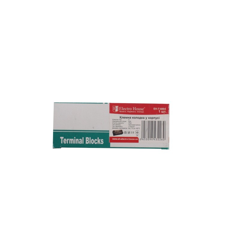 Клеммная колодка в корпусе EH-T-6004 от компании "ElectroHouse" предназначена для удобства монтажа электрических проводов в цепях управления, сигнализации, освещения и т.д.Клеммная колодка представляет собой диэлектрическое основание из негорючего пластика, на котором установлены контактные планки, надёжно изолированные друг от друга. Планки изготавливаются из лужёной латуни. Контактные планки зажимов рассчитаны на пропускание больших токов в сетях переменного тока частотой 50 Гц. Эта модель клеммной колодки в корпусе имеет четыре клеммных пары с винтовым зажимом провода, ее номинальный ток 60 А. Позволяет соединить медные и алюминиевые провода.Так же эта модель отличается высокой надежностью, долговечностью и имеет широкий температурный диапазон - она способна работать при температуре от -10 до +80 градусов Цельсия. Соответствует мировым и европейским стандартам качества.Прозрачная крышка не только служит защитой, но и позволяет визуально контролировать состояние контактов, что очень удобно. Винтовой зажим позволяет получить надежный контакт без использования специального оборудования (паяльник, прес-клещи и т.д.).Некоторые типы клеммных зажимов являются одноразовыми, как например пружинные (самозажимные), но винтовой зажим позволяет использовать это устройство многократно. Таким образом эта модель является не только надежной, но еще и экономичной. Выполнить монтаж проводов в это изделие просто и быстро.