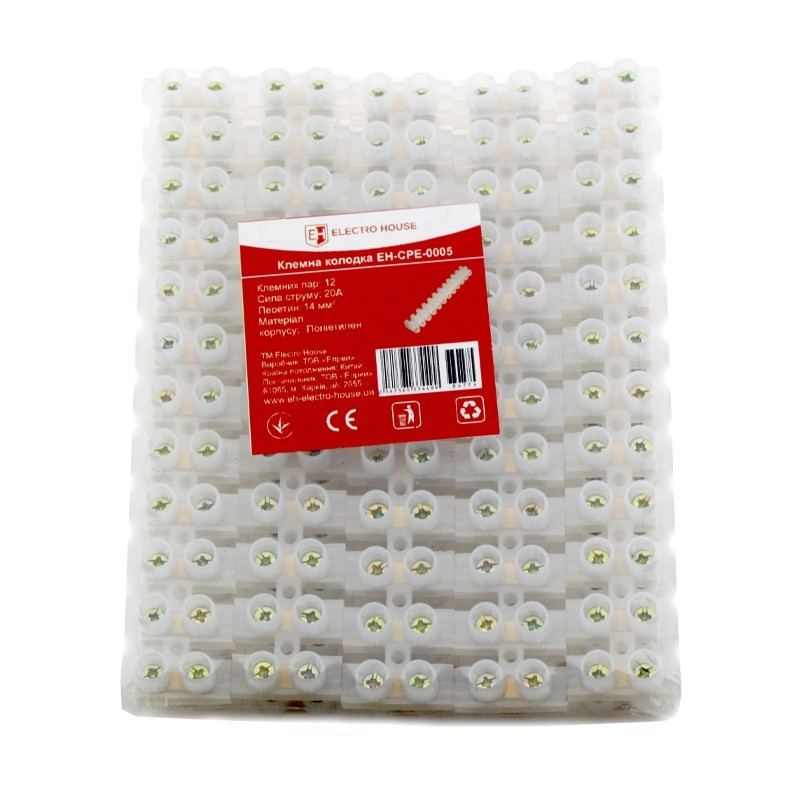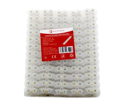 Клеммная колодка 20A 14mm² ПЭ EH - CPE - 0005 марки ElectroHouse является электротехническим изделием, предназначенным для соединения электропроводов из различных металлов (алюминия или меди), что очень удобно при выполнении монтажных работ, связанных с электропроводкой. У нее есть латунные элементы электроконтактов, которые содержатся в высокопрочном полиэтиленовом корпусе. В сборе терминал имеет двенадцать контактных пар, можно разделять и отдельно использовать. Чтобы создать электросоединение при его помощи нужно токовыводящие жили проводов завести в клемму с обеих сторон и зажать их винтами. По габаритным размерам клеммный блок достаточно компактный, поэтому легко поместится в распределительный ящик. В условиях эксплуатации характеризуется высокими износостойкими, огнеупорными и долговечными свойствами.