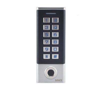 TriniX TRK-1102MFW – оборудование для СКУД сочетающее в себе и контроллер и бесконтактный считыватель и биометрический считыватель и кодовую клавиатуру. Предложенный на борту бесконтактный считыватель рассчитан на работу с идентификаторами (брелоками/карточками) популярного стандарта Mifare (13.56 Mhz) на расстоянии от 2 до 5 сантиметров. Всего в встроенной памяти устройства имеется место под 10 000 пользователей бесконтактных идентификаторов и 300 пользователей по отпечатку. Время на открытие двери возможно задать в рамках от 0 до 99 секунд. Комфорт эксплуатации TriniX TRK-1102MFW в плохо освещенной среде повышен за счет подсветки клавиатуры. Антивандальный металлический корпус прибора отвечает высокому классу герметичности IP65. Среды интерфейсов WG26 выход / вход. В питании требуется подача напряжения 12-24 Вольта. Потребление тока не более 30мА.