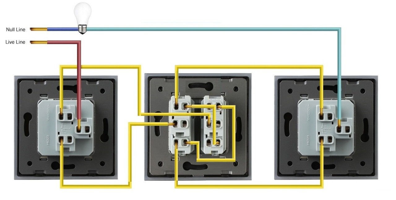 Перекрестный выключатель освещения предназначен для управления нагрузкой в режиме "включить-выключить" с возможностью управлением одним источником освещения из трех мест. Часто применяется в длинных коридорах и лестничных пролетах.