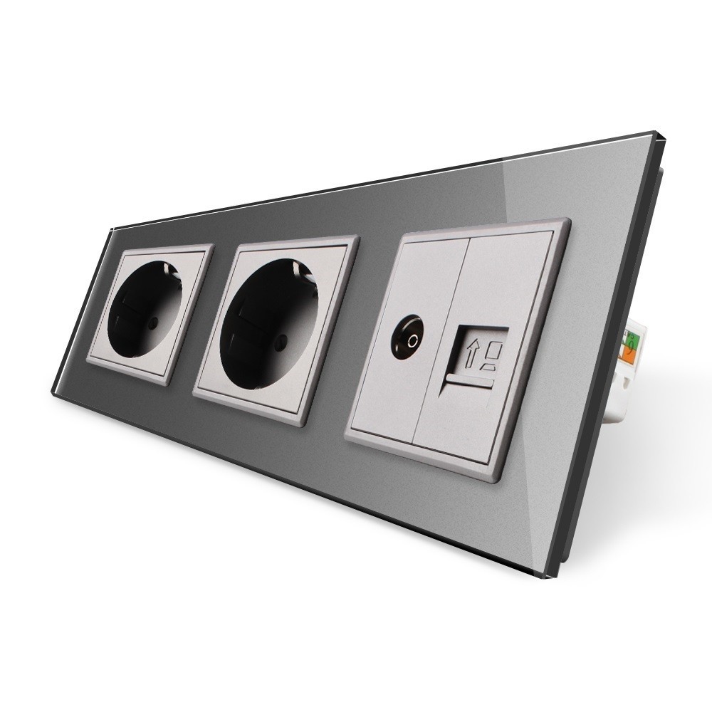 Тройная электрическая розетка евро стандарта с заземляющими контактами, защитными шторками, TV и Интернет выходами.