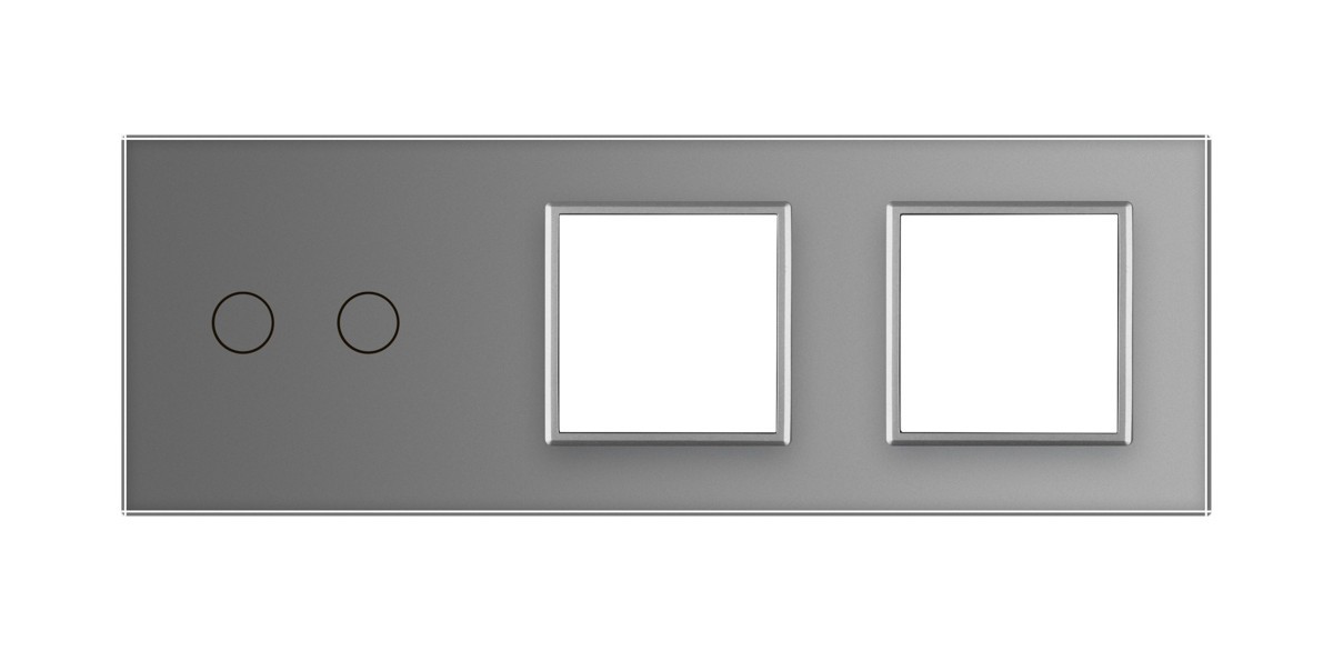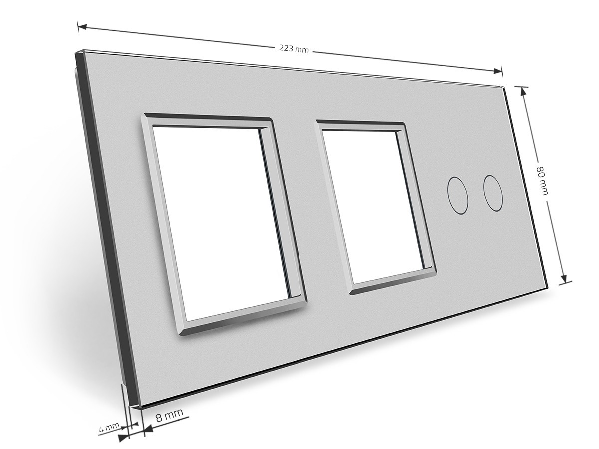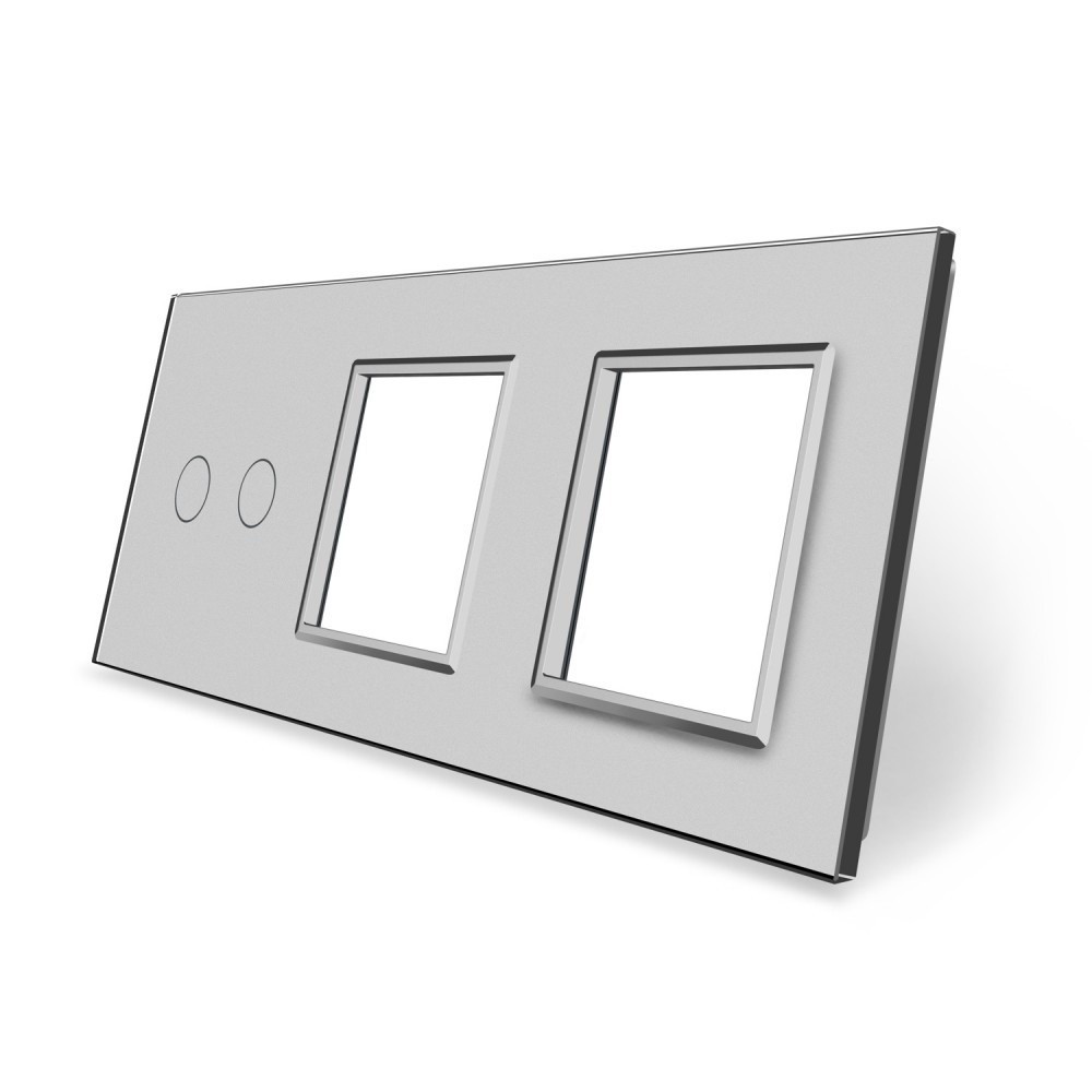 Стеклянная лицевая панель из закаленного стекла предназначена для сенсорных модулей и модулей розеток Livolo. Данный вариант панели подходит для монтажа 1-ого сенсорного выключателя для управления 2-мя зонами освещения. Двойная рамка подходит для монтажа 2х электрических розеток, 4-ух мультимедийных розеток.