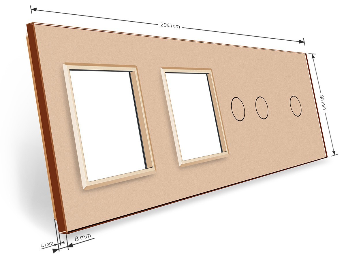 Стеклянная лицевая панель из закаленного стекла предназначена для сенсорных модулей и модулей розеток Livolo. Данный вариант панели подходит для монтажа 2-х сенсорных выключателей для управления 3-я зонами освещения. Рамка подходит для монтажа 2-х электрической розетки, 4-х мультимедийных розеток.