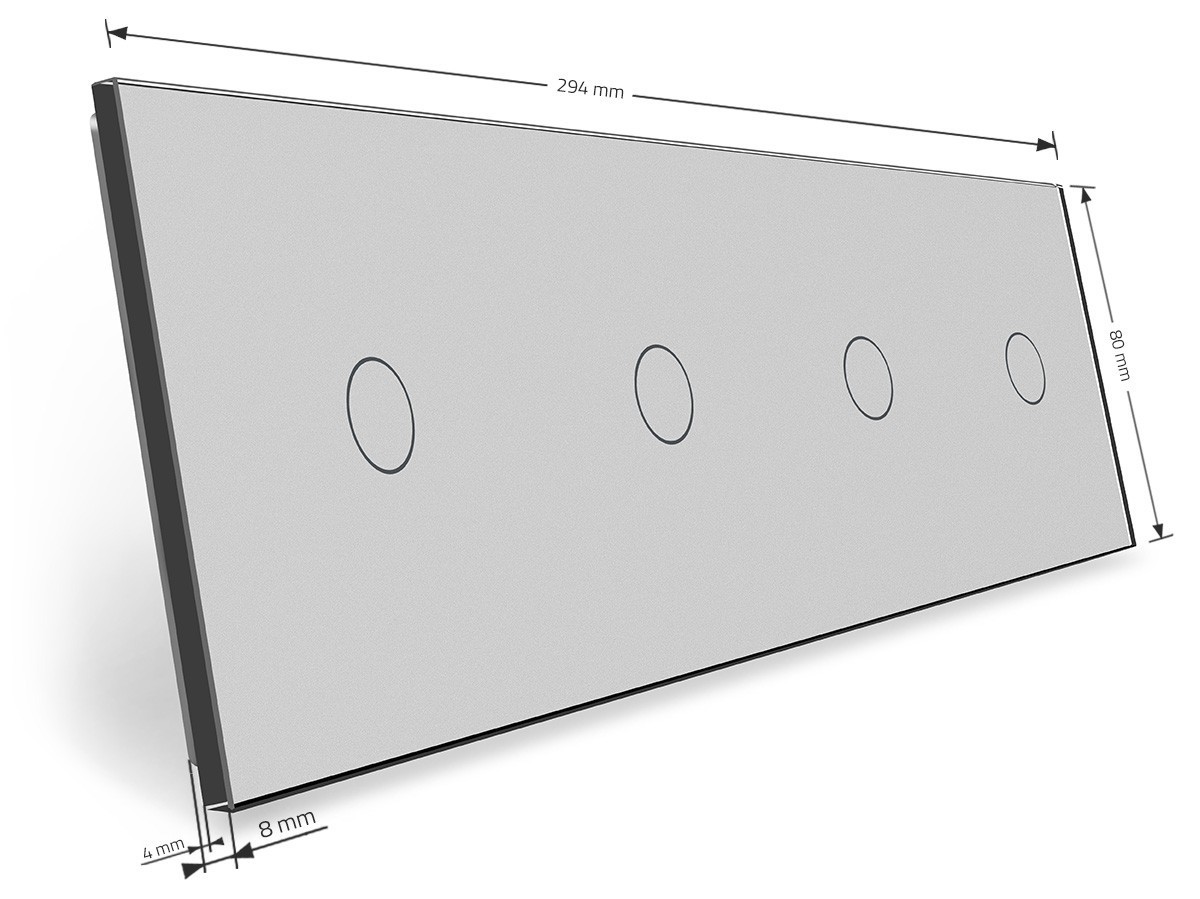 Стеклянная лицевая панель из закаленного стекла предназначена для сенсорных модулей Livolo. Данный вариант панели подходит для монтажа 4-х сенсорных выключателей для управления четырьмя (1+1+1+1) зонами освещения.