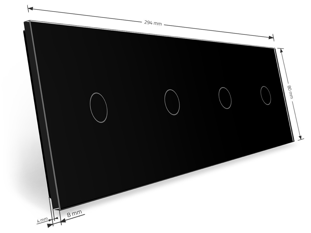 Стеклянная лицевая панель из закаленного стекла предназначена для сенсорных модулей Livolo. Данный вариант панели подходит для монтажа 4-х сенсорных выключателей для управления четырьмя (1+1+1+1) зонами освещения.