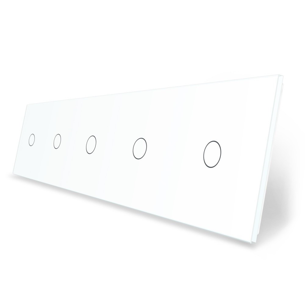 Стеклянная лицевая панель из закаленного стекла предназначена для сенсорных модулей Livolo. Данный вариант панели подходит для монтажа 5-и сенсорных выключателей для управления четырьмя (1+1+1+1+1) зонами освещения.