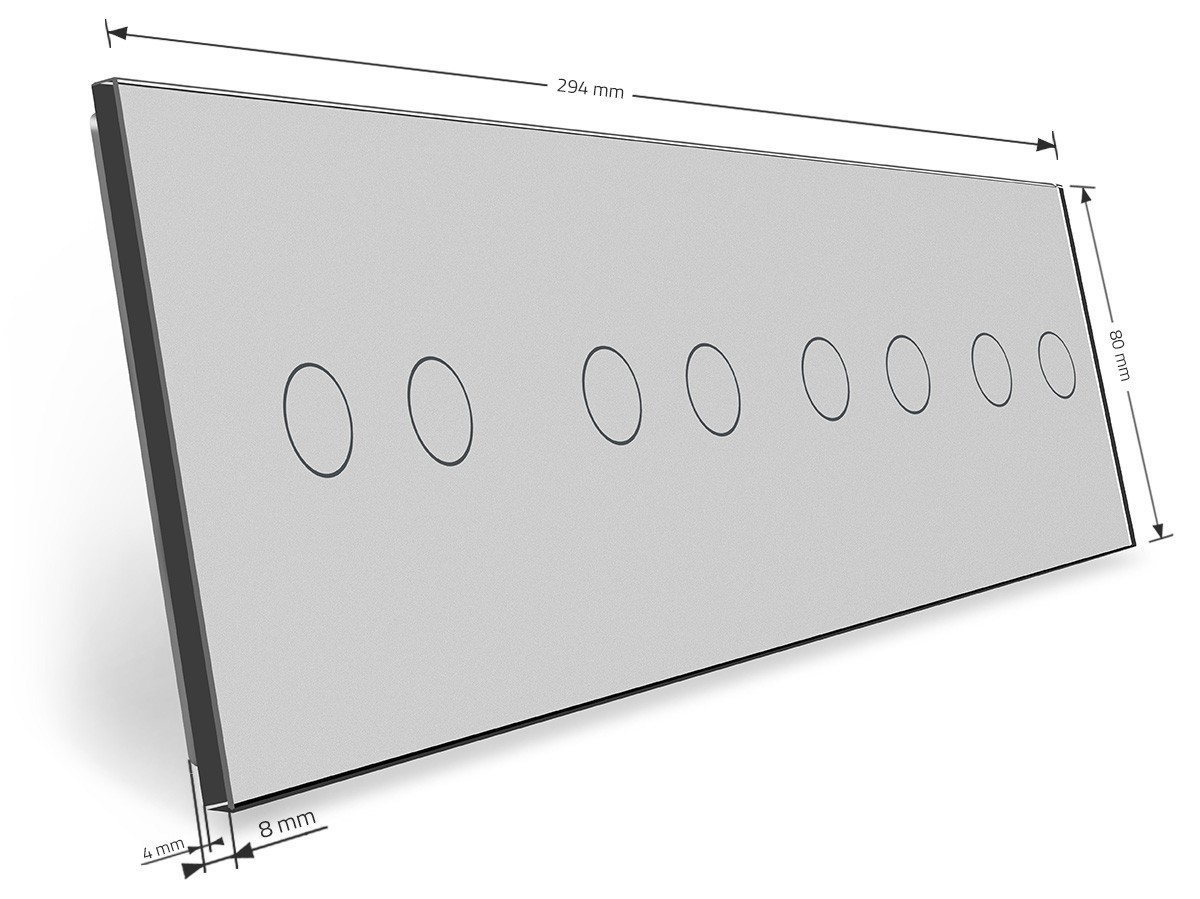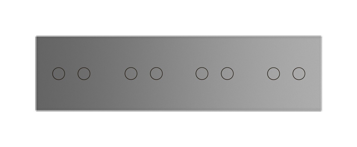 Стеклянная лицевая панель из закаленного стекла предназначена для сенсорных модулей Livolo. Данный вариант панели подходит для монтажа 4-х сенсорных выключателей для управления восемью (2+2+2+2) зонами освещения.