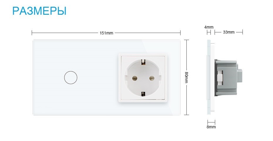 - Сенсорный выключатель с розеткой в сборе или сенсорный модуль + модуль розетки + стеклянная лицевая панель