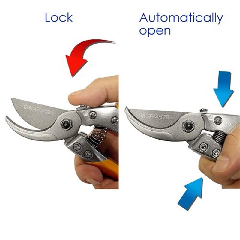 Лезвие. Остро заточенные лезвия секатора выполнены из прочной высокоуглеродистой стали SK5, которая характеризуется большой прочностью и износоустойчивостью. Верхнее лезвие имеет специальное покрытие NON-Stick, которое защищает лезвие от повреждений и значительно уменьшает силу трения лезвия по древесине, что позволяет облегчить и ускорить процесс обрезки. Покрытие NON-Stick оберегает лезвие от налипания мякоти древесины, что обеспечивает возможность непрерывной работы секатором.