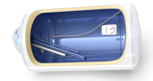 - «сухой» нагревательный элемент, состоящий из двух электрических нагревательных элементов, помещенных в изолированную колбу со стеклокерамическим покрытием. Сухой нагревательный элемент не имеет прямого контакта с водой, а колба обладает низкой поверхностной температурой, что снижает отложение накипи на его поверхности, а значит, продлевает срок службы нагревательного элемента;
