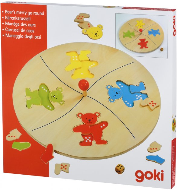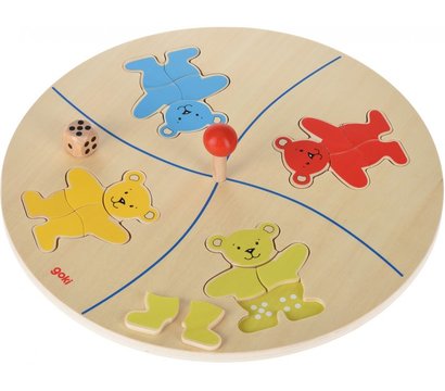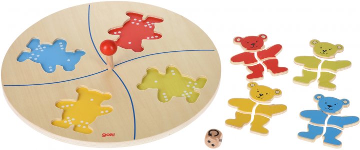 "Веселые мишки" - игра на память, внимательность, логику и удачу. В настольную игру необходимо играть вчетвером. Цель игры - как можно быстрее сложить фигурку мишки из пяти деталей. Для этого необходимо бросать кубик и избирать фрагменты фигурки. Будьте внимательные, ведь неожиданно игра может измениться и теперь вы должны складывать фигурку мишки другого цвета. Рекомендованный возраст участников: 3 . Производитель - немецкий бренд goki, авто качественных, полезных, развивающих, безопасных игрушек, изготовленных из сертифицированных материалов.
