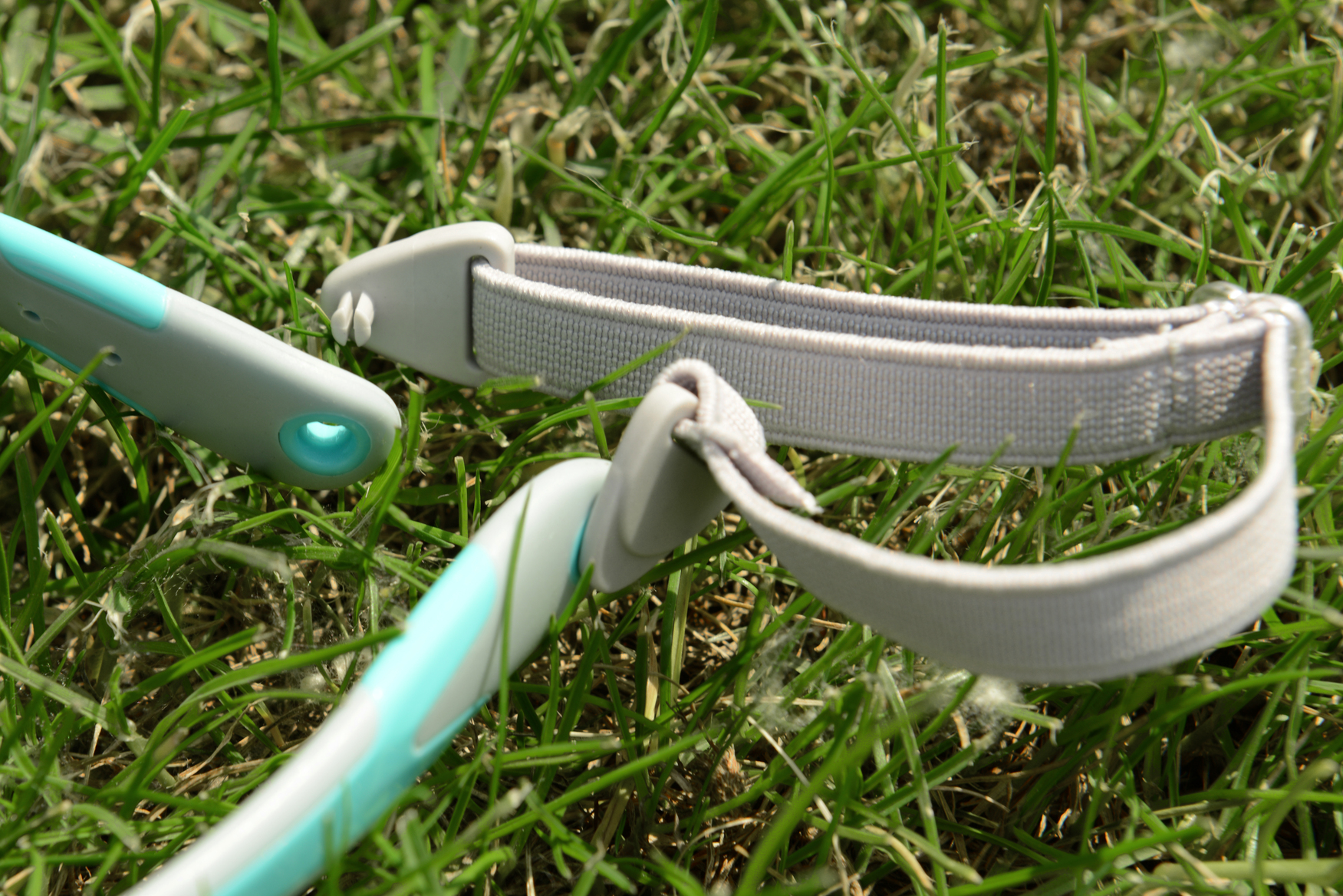 Эти солнцезащитные очки изготовлены из гибкого эластомера, а линзы – из небьющегося поликарбонатного материала с зеркальным покрытием. Модель выполнена в бирюзовом цвете с оправой и дужками с серыми вставками, ремешок крепится к очкам с помощью светло-серых матовых соединительных элементов. На дужках - аккуратно впечатанный логотип KOOLSUN.
