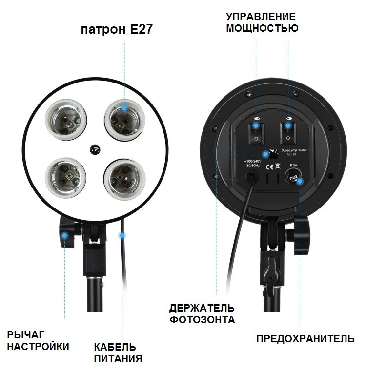 На передней части осветителя расположены стандартные крепления E27 для четырех ламп, сзади находится блок управления мощностью, позволяющий индивидуально вкл. или выкл. лампы попарно, что обеспечивает половинную регулировку мощности - 50/100%.