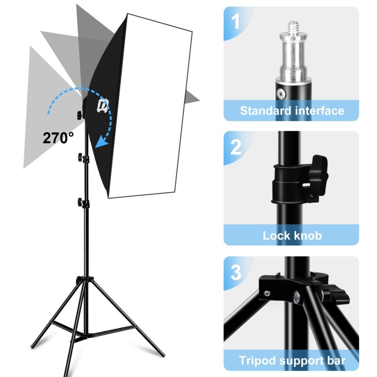 Угол освещения софтбокса может регулироваться держателем лампы на 270 градусов, чтобы адаптироваться к различным потребностям съемки, обеспечивая подходящий свет с разных углов.