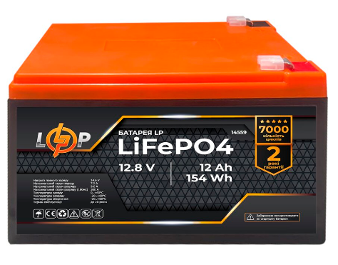 - Акумуляторна батарея LP LiFePO4 12.8V 12Ah (154Wh, розмір: 150х100х97 (ДхШхВ)))