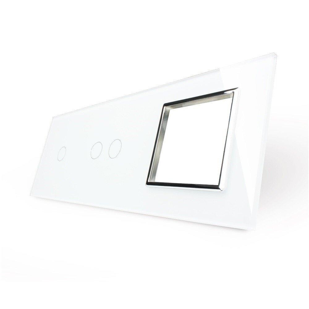 Стеклянная лицевая панель из закаленного стекла предназначена для сенсорных модулей и модулей розеток Livolo. Данный вариант панели подходит для монтажа 2-х сенсорных выключателей для управления 3-я зонами освещения. Рамка подходит для монтажа 1-й электрической розетки, 2-х мультимедийных розеток.