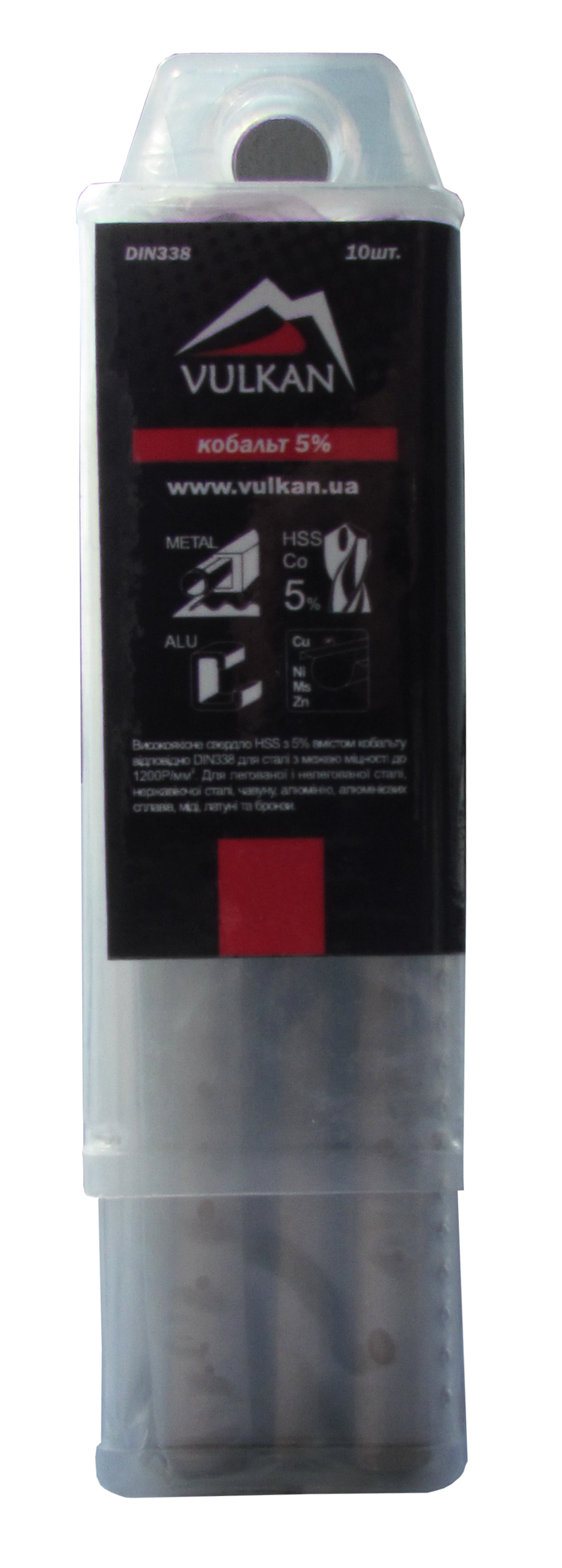 При виробництві спіральних свердл ТМ Vulkan використовується швидкорізальна сталь HSS з 5% вмістом кобальту, виготовлені згідно DIN 338 для сталі з межею міцності до 1200Р/м2. Свердло має попит у виробничих підприємствах на лініях металообробки та в майстернях. Точно заточене свердло з різальною частиною типу А дозволяє швидко виконувати роботи по бурінню отворів в легованої та нелегованої сталі, чавуні, кольорових металах (мідь, нікель, цинк, латунь), нержавіюча стала та пластик. Свердло із двома різальними кромками, циліндричне, двоканавкове з перехресним заточенням 135° (від 3 мм).