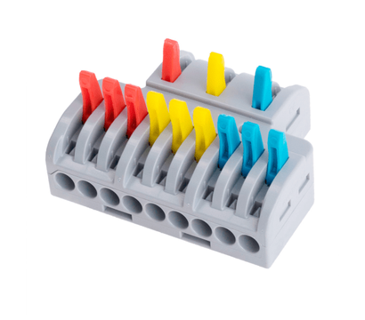 Voltronic LT-933 Gray – клеммная колодка с нажимными рычагами на 3x9 проводов для распределительных коробок. Клемма идет в пластиковом корпусе. Номинальный ток составляет 32 Ампера. Цвет серый.