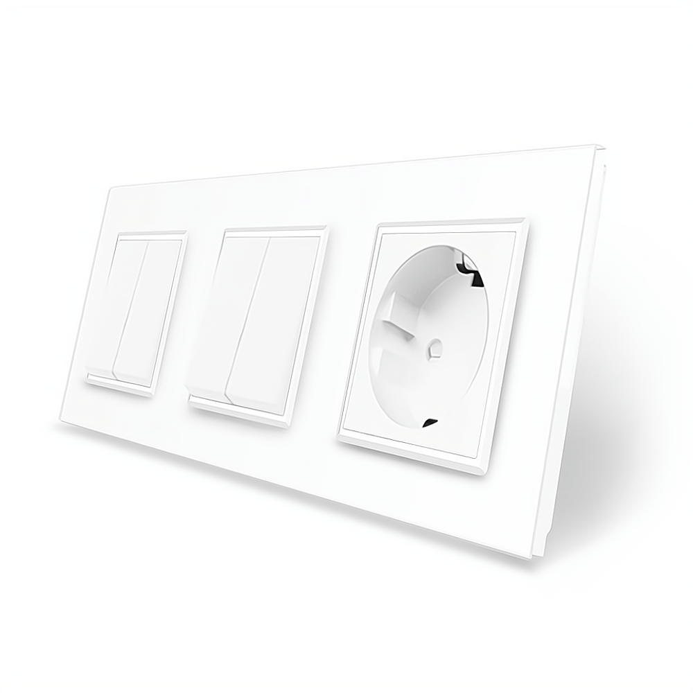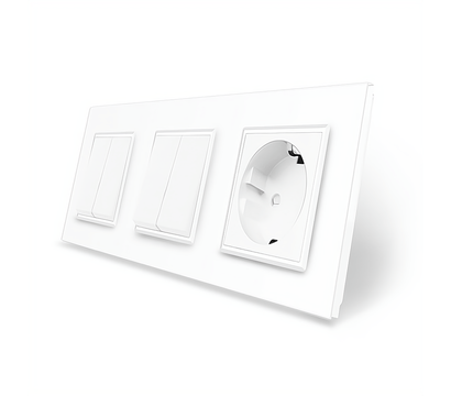 Livolo VL-C7K2/K2/FCTC16A-6WP White glass – клавишный выключатель (2-2) скомбинированный с бытовой розеткой. Бытовая розетка предоставлена с контактами заземления. Крепление проводов происходит при помощи винтов. Монтаж производится врезным образом. Размеры корпуса: 223 на 80 миллиметров. Рамка устройства исполнена из стекла. Цвет белый. Рабочее напряжение 220 Вольт.