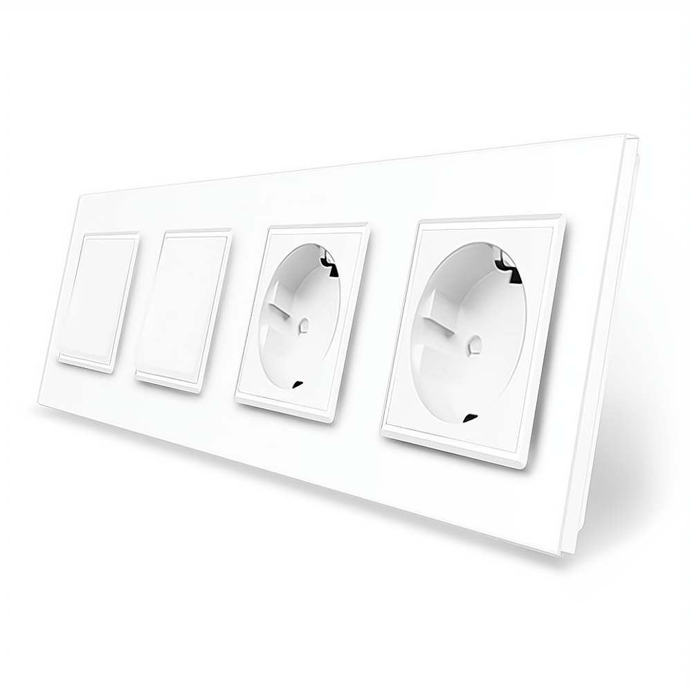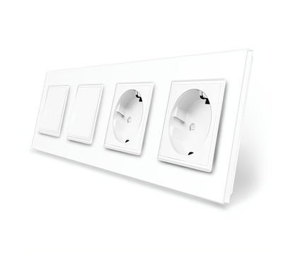 Livolo VL-C7K1/K1/FCTC16A/FCTC16A-8WP White glass – комбинированная модель сочетающая в себе выключатель (1-1) клавишный и двух портовую бытовую розетку. В качестве материала для рамки было предложено закаленное стекло. Крепление винтов происходит при помощи винтов. Размеры: 294 на 80 миллиметров.