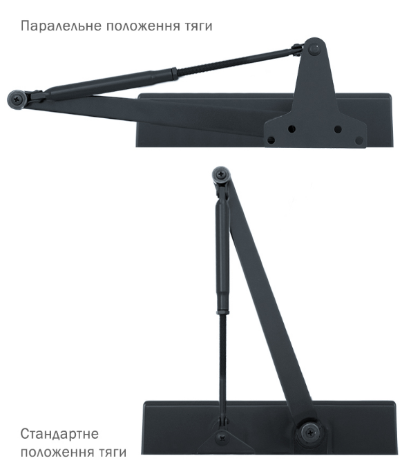 В комплектацию к доводчику идет универсальная тяга (стандартная, кронштейн паралельної тяги).