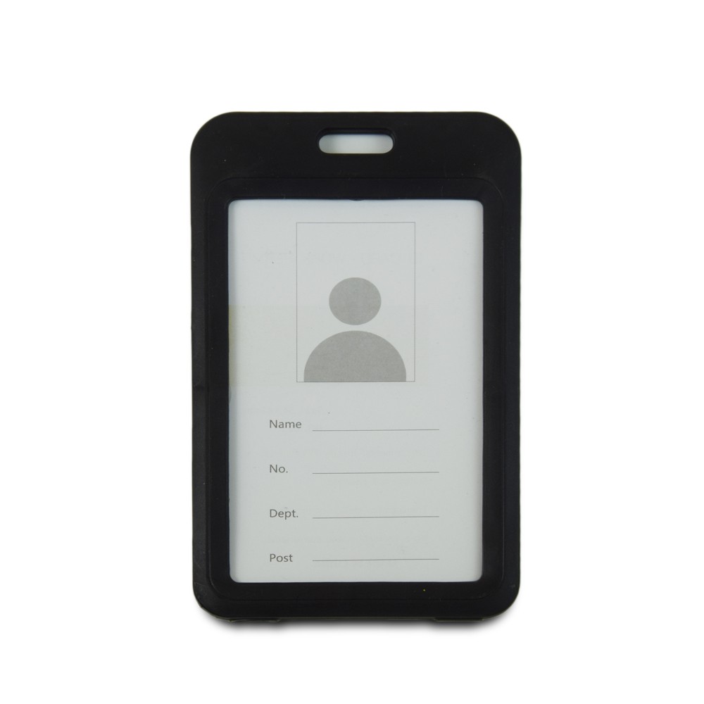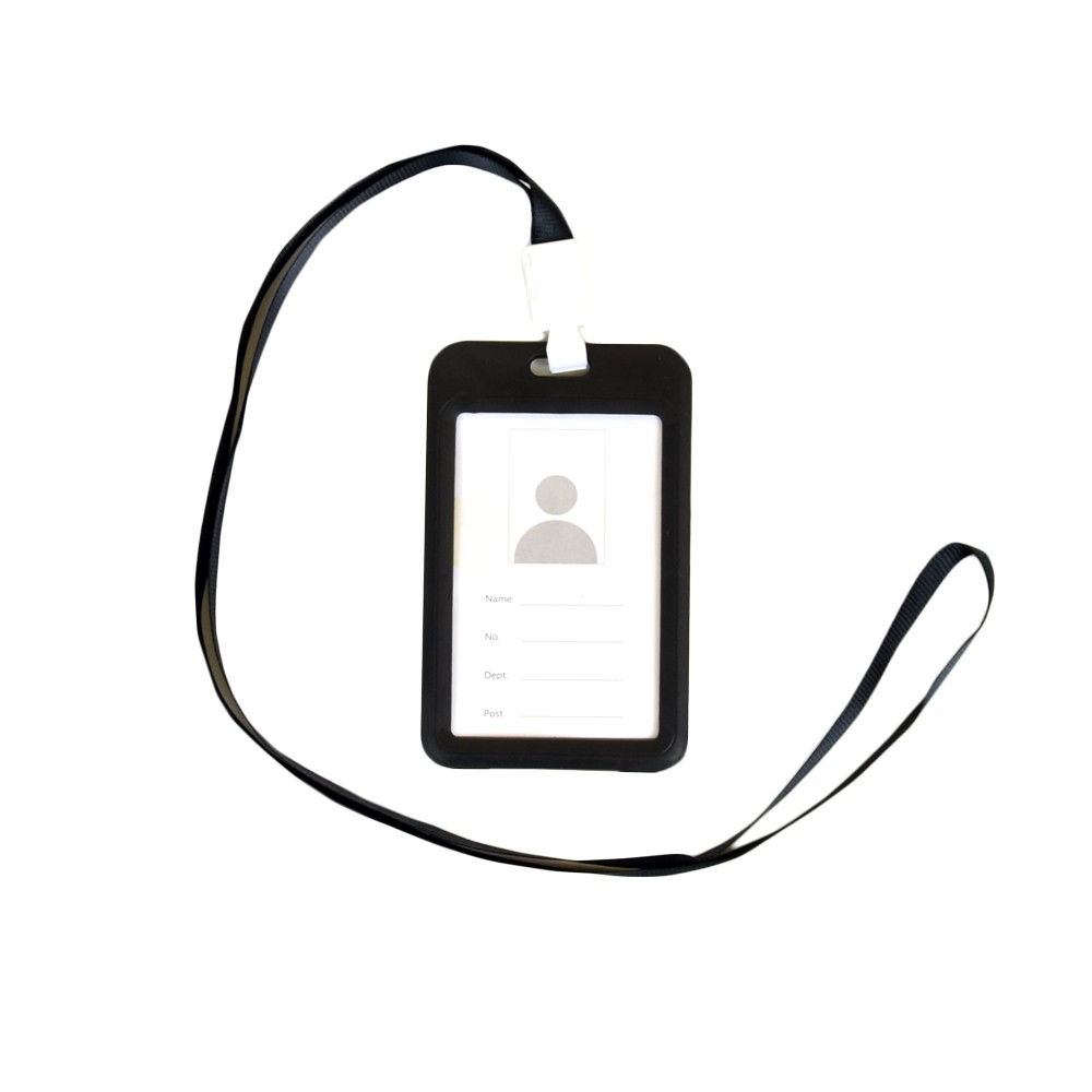 Вертикальный пластиковый бейдж черного цвета на шнурке длиной 37 сантиметров. Позволяет задать идентификацию сотрудников разместив на нем имя сотрудника, эго должность или отдел. Размеры бейджа 111x69x5 миллиметров.