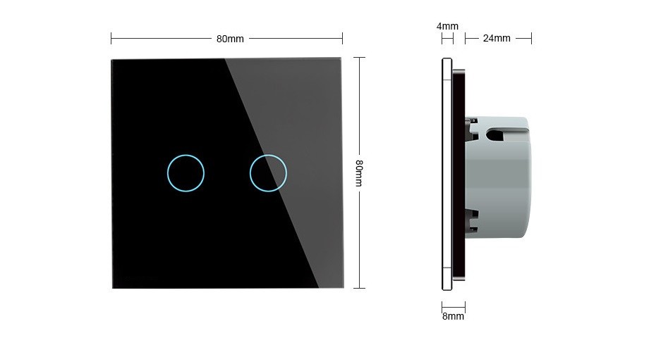 - Лицевая поверхность изготовлена из высокопрочного прозрачного стекла с окраской изнутри, тем самым обеспечивая высокий срок службы и возможность очистки данного сенсорного выключателя;
