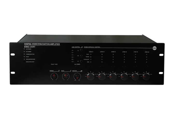 CMX EVAC-500RT – усилитель-маршрутизатор мощности 500 Ватт на 6 зон (12 линий). С успехом возможно расширить количество зон до 120. В распоряжении устройства идет тот же функционал что и в контроллера EVAC-500, включая контроллер пейджинга зон, мониторинг всех основных сигнальных линий, управление усилителем, контроль линий громкоговорителей, мониторинг работы блока питания и усилителя мощности, интерфейс пожарной сигнализации, при этом все сигналы подаются от главного контроллера. Корпус состоит из прочного металла. Размеры усилителя: 484x132x449 миллиметров. Питание: 230 Вольт/24 Вольта.