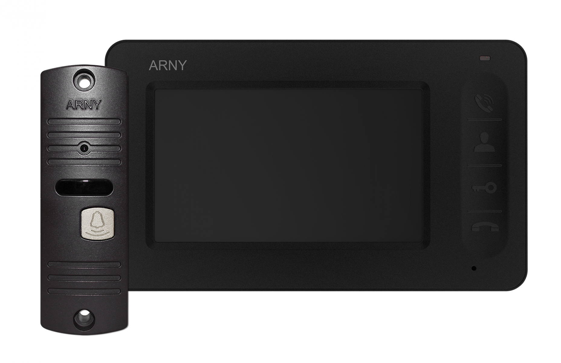 Arny AVD-4005 Black/Brown v.2 - превосходный домофонный комплект на базе 4,3 дюймового TFT LCD монитора AVD-410 и антивандальной видеопанели Arny AVP-05 v.2. Хотя в комплектации идет только одна панель максимальное количество поддерживаемых панелей домофоном составляет две. Такое же количество возможно и камер. В домофон уже встроен блок питания. Встроенный 4,3 дюймовых экран способен вести восхитительное отображение картинки при разрешающей способности 480 на 272 пикселя. Цвет корпуса домофона черный. Размеры: 151х90х25 мм.